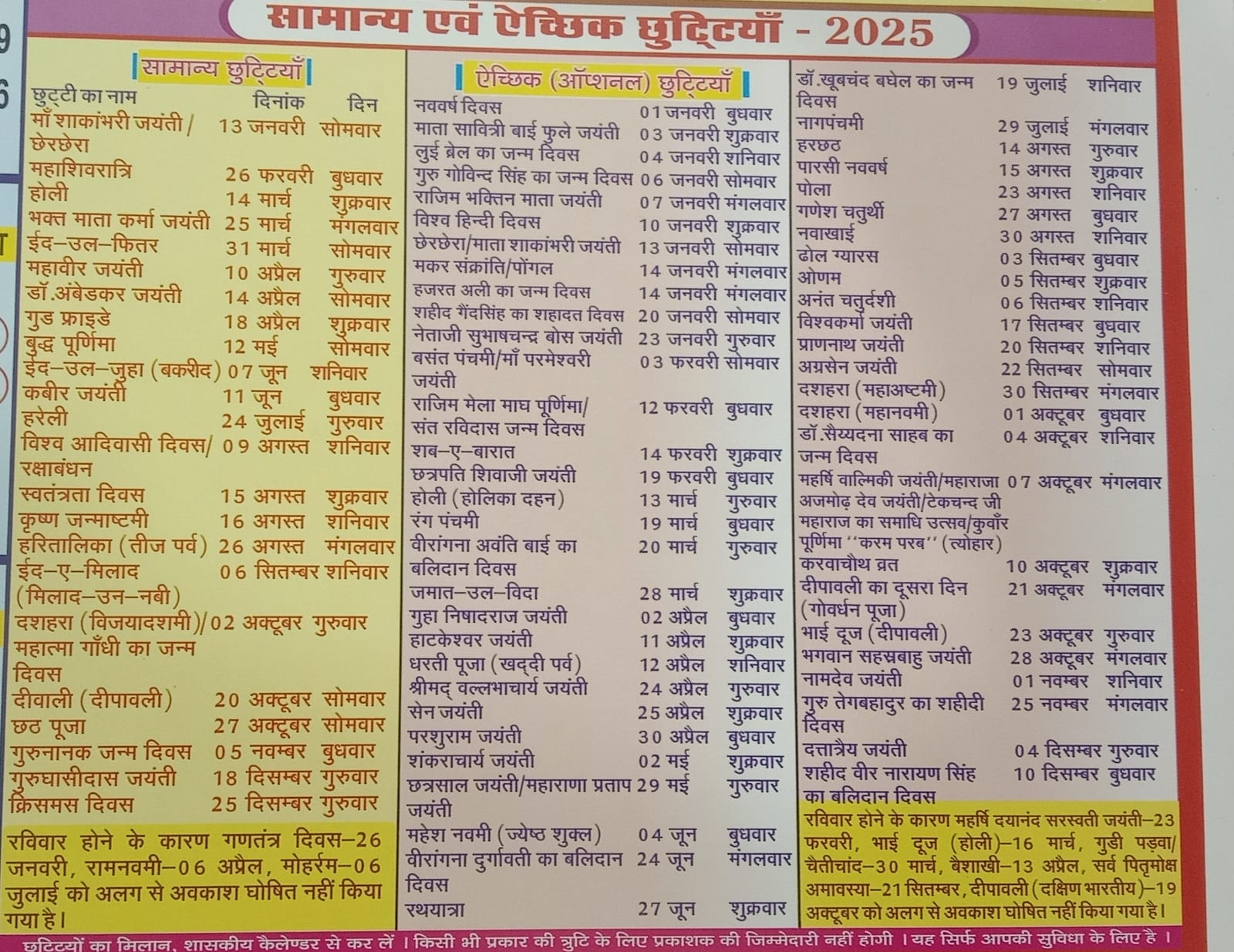 List of Holidays - 2025